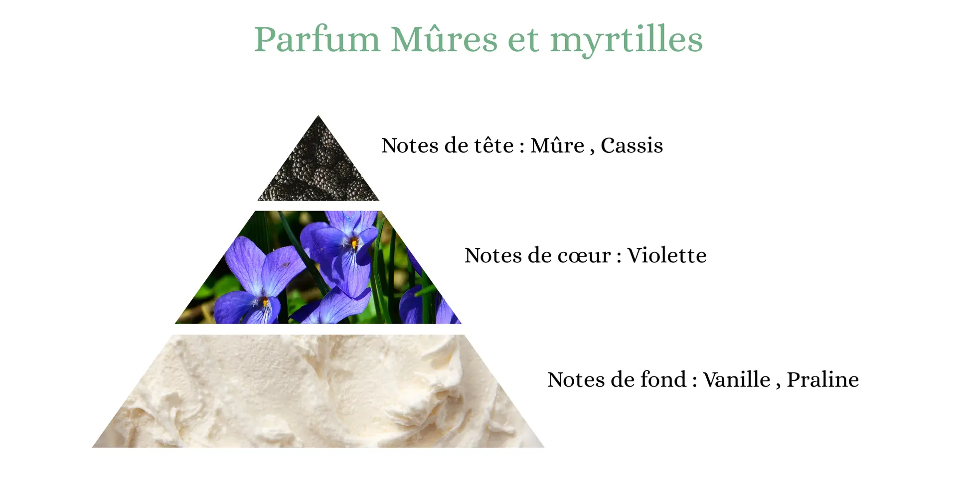 Une odeur intense de fruits noirs bien mûrs, adoucie par une touche florale délicate et une base vanillée pralinée, douce et enveloppante.